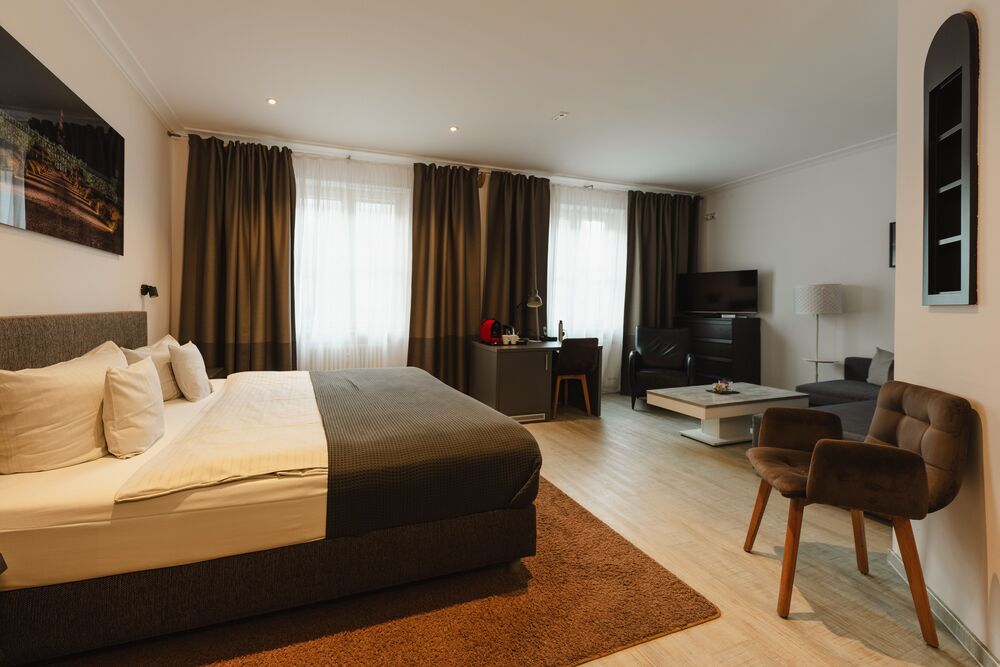 Die Kaiserhof Junior Suiten verfügten über einen offen gestalteten Wohn- und Schlafbereich, ein großes Boxspringbett (2,00×2,00m) und eine gemütliche Couch- und Sitzecke. Außerdem erwartet Sie eine Kapselmaschine zur Tee- und Kaffeezubereitung und besonders viel Platz. Ein besonderes Highlight unserer Junior Suiten ist das luxuriöse Badezimmer mit Eckbadewanne oder Whirlpool. Als Extra zur Buchung eines Superior Zimmers erhalten Sie eine Snackbox und eine Bluetooth-Box zum Verleih.